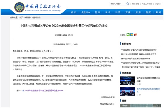 喜报!中国地质学会荣获2022年度全国学会科普工作优秀单位