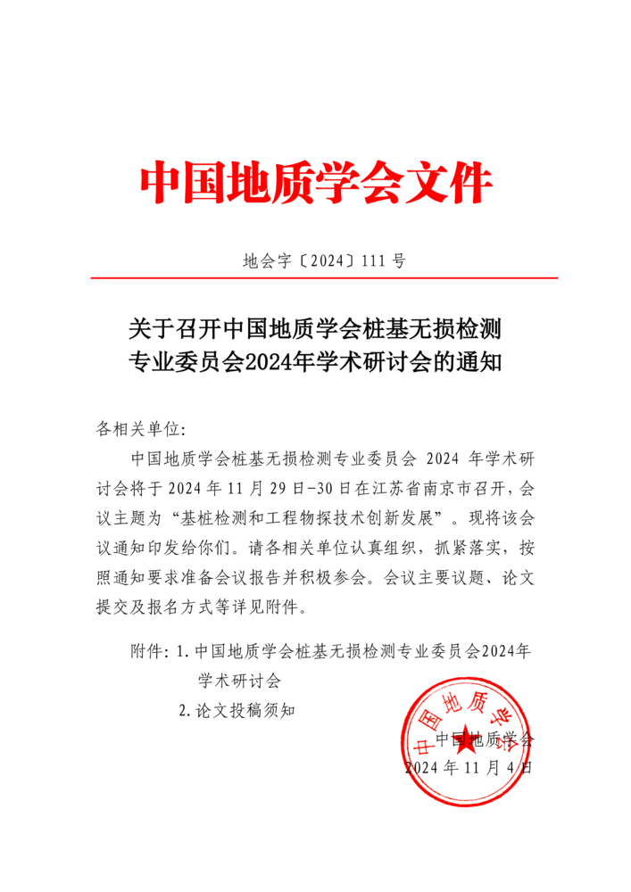 ? 关于召开中国地质学会桩基无损检测专业委员会2024年学术研讨会的通知 2024-11-06