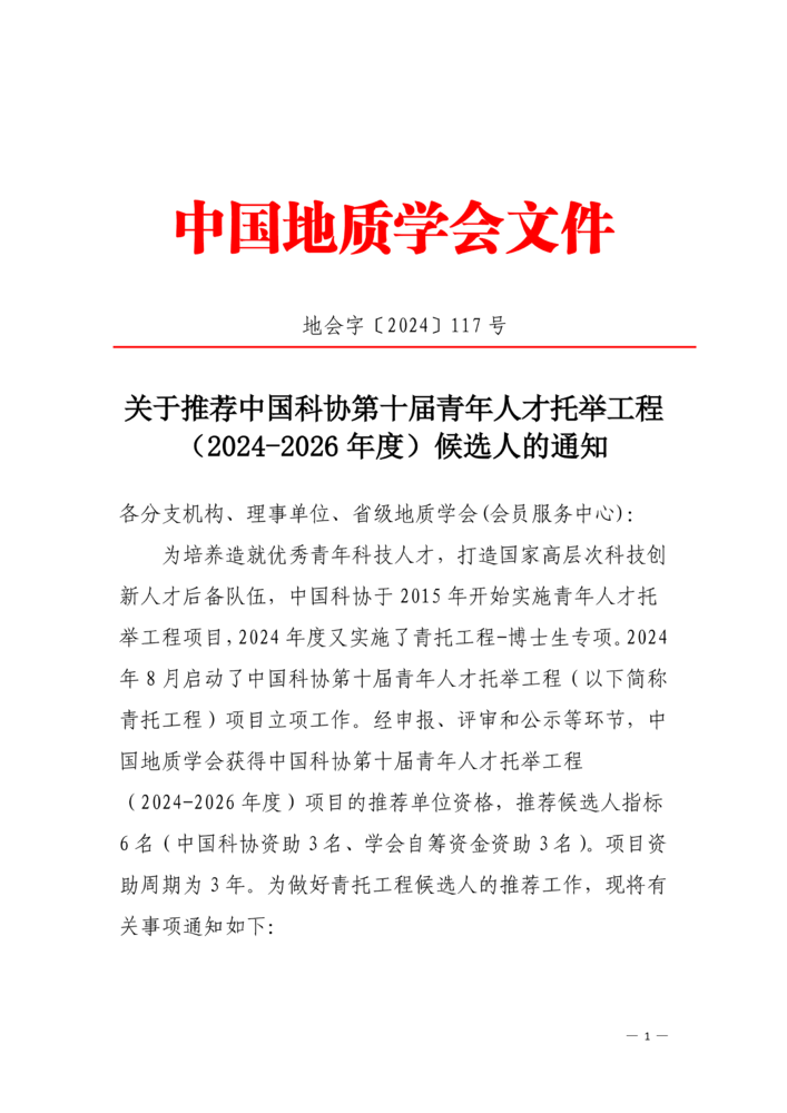 ? 关于推荐中国科协第十届青年人才托举工程(2024-2026年度)候选人的通知 2024-11-15